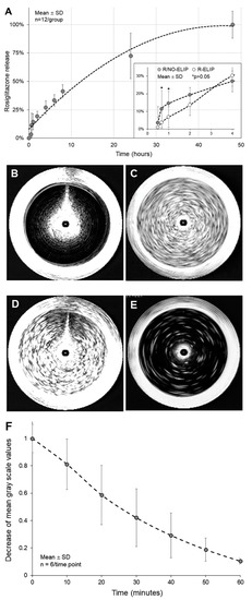 NO has been shown to have therapeutic effects at low doses but can become toxic at high doses. We have demonstrated 0.045 μmol of NO encapsulation in 1 mg of liposomes without any observed side effects [24]. This encapsulation method also rendered the liposomes echogenic, enabling ultrasound imaging (Figure 1B–E). The release of NO from R/NO-ELIP was evaluated by measuring the echogenicity of the liposomes. A gradual release of NO from R/NO-ELIP was found over 60 min (Figure 1F).