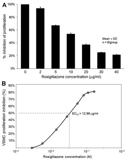 Quiescent VSMCs were stimulated by 10% FBS and exposed to varying concentrations of rosiglitazone. FBS was found to promote VSMC proliferation, while rosiglitazone treatment inhibited serum-stimulated growth in a dose-dependent manner (Figure 2A), with an EC50 value of 12.96 μg/mL (Figure 2B).