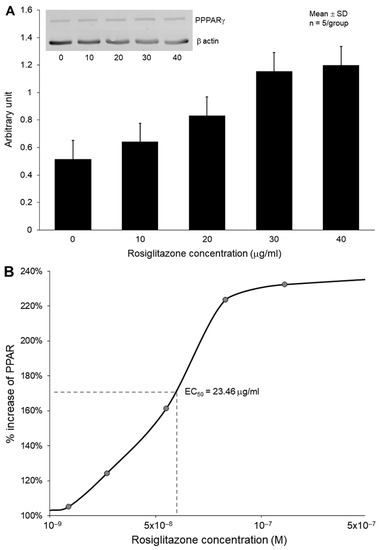 Effect of R/NO-ELIP on HUVECs. (A) Rosiglitazone treatment exhibited a dose-dependent increase in PPAR phosphorylation expression (B) with EC50 at 23.46 μg/mL.