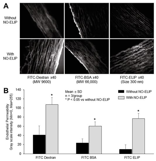 The impact of NO-ELIP on endothelial permeability was evaluated using rabbit aortas ex vivo. The aortas were treated with 100 µg of NO-ELIP for 2 min and compared to the control group. To determine the impact of NO-ELIP treatment on endothelial permeability, fluorescein-labeled molecules with varying sizes, including FITC-dextran (MW 9600), FITC-BSA (MW 66,000), and FITC-liposomes (300 nm in size), were administered to the aortas and incubated for 10 min. Following incubation, the aortas were washed, snap-frozen, and subjected to histological sectioning and fluorescent microscopy analysis.