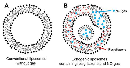 Schematics of the liposomal platform designed for co-encapsulation and delivery of therapeutic gas and therapeutic agents. (A) The conventional liposome with lipid bilayers comprising hydrophilic and hydrophobic cores. (B) Echogenic liposome allowing the co-encapsulation of therapeutic gas and therapeutic agents. Upon encapsulation, NO behaves similarly to hydrophobic drugs, residing either between the two monolayers of the liposome bilayer or within the bilayer of liposomes for energetic reasons. When co-encapsulated with bioactive gas, hydrophobic therapeutics such as rosiglitazone remain in the lipid bilayer.