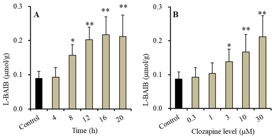 Time-dependent (A) and level-dependent (B) effects of clozapine on the intracellular levels of L-β-aminoisobutyric acid (L-BAIBA) in the astrocytes. (Panel A) displays the time-dependent effects of 30 μM clozapine (ranging from 4 to 20 h). (Panel B) indicates the level-dependent effects of clozapine (ranging from 0 to 30 μM) for 12 h. Ordinate indicates mean ± SD (n = 6) of intracellular levels of L-BAIBA (μmol/g protein). * p < 0.05, ** p < 0.01: relative to the control based on an analysis of variance (ANOVA) with Scheffe’s post hoc test.