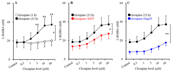 Level-dependent effects of clozapine and the interaction between clozapine and inhibitors of synaptobrevin (tetanus toxin: TeNT) and the connexin43-containing hemichannel (TAT-Gap19) on astroglial ripple-evoked L-BAIBA release. (Panel A) indicates the level-dependent effects of clozapine (ranging from 0 to 30 μM) for 1 h (opened circles) and 20 h (closed circles) on ripple-evoked astroglial L-BAIBA release. (Panel B) indicates the level-dependent effects of clozapine (0–30 μM) for 20 h (closed circles) after incubation in a cultured medium with (red circles) or without (closed circles) tetanus toxin (TeNT: 3 μg/mL) for 24 h on ripple-evoked L-BAIBA release. (Panel C) indicates the level-dependent effects of clozapine (0–30 μM) for 20 h (closed circles) after incubation in a cultured medium with (blue circles) or without (closed circles) Gap19 (20 μM) on ripple-evoked L-BAIBA release. Ordinate: mean ± SD (n = 6) of the extracellular L-BAIBA level (nM). * p < 0.05, ** p < 0.01: relative to clozapine exposure for 1 h based on a two-way ANOVA with Scheffe’s post hoc test.