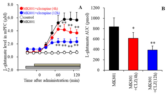 Effects of the perfusion of clozapine (CLZ) into the mPFC on L–glutamate release in the mPFC induced by the perfusion of 10 μM MK801 into RTN (MK801–evoked stimulation). Perfusion medium in the mPFC commenced with MRS with or without (control) 30 μM clozapine. After perfusion with clozapine for 4 h or 12 h (grey bars), the perfusate in the RTN was switched from MRS to MRS containing 10 μM MK801 for 120 min (brown bars). (Panel A): Ordinates and abscissa indicate the mean ± SD (n = 6) of extracellular L–glutamate levels (μM) and time after MK801–evoked stimulation (min). (Panel B) indicates the area under curve (AUC) values of MK801–evoked L–glutamate release in the mPFC (pmol). (A): * p < 0.05, ** p < 0.01: relative to MK801 alone based on a MANOVA with Scheffe’s post hoc test. In (B): * p < 0.05, ** p < 0.01: relative to the ACU of MK801 alone based on a MANOVA with Scheffe’s post hoc test.