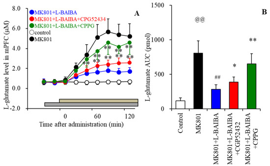 Interactions between the perfusion of 1 μM L–BAIBA and antagonists of GABAB–R (50 μM CGP52434) and III–mGluR (100 μM CPPG) into the mPFC on MK801–evoked L–glutamate release in the mPFC. The perfusion medium in the mPFC was based on MRS with or without (MK801) 1 μM L–BAIBA, 1 μM L–BAIBA plus 50 μM CGP52434, or 100 μM CPPG (grey bars). The perfusate in the RTN was switched from MRS to MRS containing 10 μM MK801 for 120 min (brown bars). (Panel A) Ordinates and abscissa indicate the mean ± SD (n = 6) of extracellular L–glutamate levels (μM) and the time after MK801–evoked stimulation (min). (Panel B) indicates the AUC values of MK801–evoked L–glutamate release in the mPFC (pmol). (A): ** p < 0.01: relative to MK801+L–BAIBA based on MANOVA with Scheffe’s post hoc test. (B): @@ p < 0.01 relative to the control, ## p < 0.01 relative to MK801, * p < 0.05, ** p < 0.01: relative to MK801+L–BAIBA by MANOVA with Scheffe’s post hoc test.