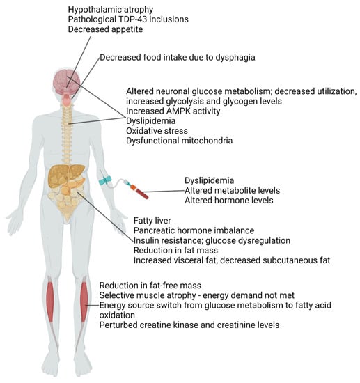 Early clinical indicators of ALS have enhanced our understanding of the disease pathogenesis and provided clues on prognostic factors that may affect the course and outcome of ALS patients. Early clinical signs include weight loss, metabolic disturbances, and hypermetabolism [5,6,7]. Hypermetabolism refers to an excessive increase in measured resting energy expenditure (REE) when compared to the predicted REE [7]. Hypermetabolism is associated with increased catabolism of carbohydrates, proteins, and lipids, ultimately leading to weight loss and muscle wasting [7]. Importantly, accumulating evidence has revealed that ALS patients show muscle atrophy and weight loss before the loss of motor neurons and the onset of neurological symptoms [8,9], supporting the hypothesis that metabolic dysfunction or hypermetabolism may play a pivotal role in the early stages of ALS development. This review will examine recent advances in research on the multisystemic metabolic dysfunction that contributes to ALS development and progression.