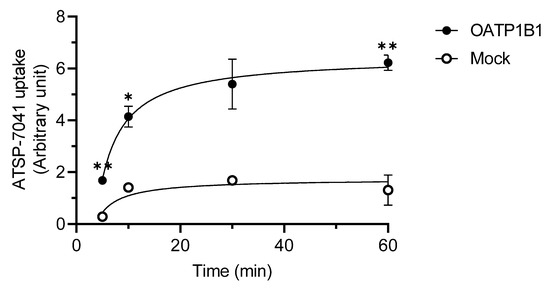 Time-dependent uptake of ATSP-7041 by OATP1B1-expressing HEK293 cells. ATSP-7041 (0.2 μM) was incubated with OATP1B1-expressing HEK293 cells (filled circle) and mock cells (open circle) for indicated periods at 37 °C. Data are presented as mean ± SD (n = 3). * p < 0.05 and ** p < 0.01, compared with the control (mock cells).
