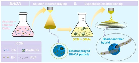 Firstly, the water-insoluble polymer CA and drug BH were co-dissolved into a solvent mixture containing acetone, ethanol, and DMAc with a volume ratio of 4:1:1. After some pre-experiments, the solid microparticles could be prepared through a single-step and straightforward electrospraying process. Later, these microparticles were dispersed into the co-dissolving solution containing PVP and BH in a solvent mixture containing DCM and DMAc with a volume ratio of 9:1. The CA particles did not dissolve in the solvent mixture. Thus, the working fluid was a suspension. After the electrospinning of the suspension, the hybrids containing both nanofibers of PVP and microparticles of CA were prepared, and the drug BH was distributed both in the nanofibers and also in the microparticles.