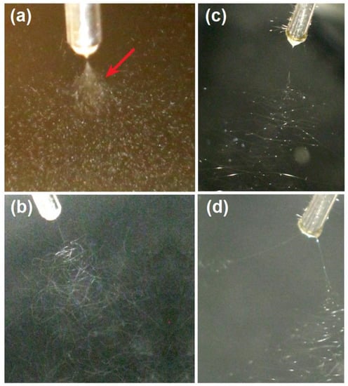 Digital pictures taken from the different EHDA working processes: (a) a typical electrospraying process for fabricating the microparticles E1, the red arrow indicates a splitted and fast moving region; (b) a typical solution electrospinning process for creating the nanofibers E2; (c) a typical suspension electrospinning process for producing hybrids of E3; (d) an abnormal EHDA process when treating the suspension under a super high applied voltage.