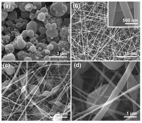 EHDA processes are hydrodynamic atomization procedures that are initiated by an applied high voltage, and they are exploited to prepare solid products by taking advantages of the easy interactions between electrostatic energy and working fluids [52,53]. For electrospinning, the solid products are often nanofibers resulted from the continuous drawing of viscous polymer fluid jets [54,55,56]. For electrospraying, the solid products are typically microparticles that resulted from the fission and repelling of droplets [57]. Thus, based on the capabilities of these two EHDA processes, a new type of trans-scale hybrids can be conceived as Figure 1, and three kinds of EHDA products were fabricated according to the conditions listed in Table 1.