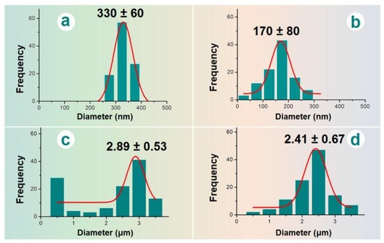 The average diameters of EHDA products: (a) nanofibers E2; (b) the nanofibers of hybrids E3; (c) microparticles E1; (d) the microparticles of hybrids E3.