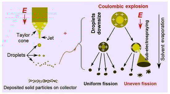 Although there is no general theory for instructing the implementation of EHDA processes, there are abundant suggested mechanisms in the literature for the treatment of a certain working fluid, both for electrospinning and electrospraying. Those mechanisms are important for the continuous and robust production and duplication of the EHDA products. Meanwhile, as more and more EHDA products are going into the commercial markets, these mechanisms for optimizing the production processes, and other related issues such as energy-saving, safety implementation, and environmental friendliness and projecting their places for the final social benefits and a better people life [71,72,73,74]. In this work, the mechanism for the strange phenomenon of many satellites is diagrammed in Figure 5. In the left part, a whole electrospraying process is sketched, i.e., a Taylor one, to a convergent point, and later to the Coulombic explosion region, in which the droplets were continuously splitted and reduced, until the formation and deposition of solid particles on the collector.