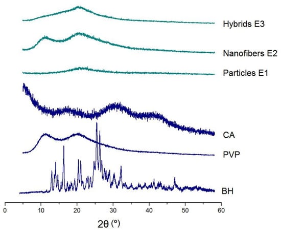 XRD patterns of the raw materials (CA, PVP, and BH) and their EHDA products (hybrids E3, nanofibers E2, and particles E1).
