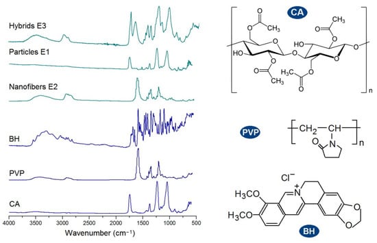 FTIR spectra of the raw materials (CA, PVP, and BH) and their EHDA products are shown in the left part of Figure 7. The molecular formats of CA, PVP, and BH are shown in the right part of Figure 7. CA had its characteristic peaks at 1724, 1376, 1236, and 1051 cm−1. PVP had its characteristic peaks at 1662, 1423, and 1291 cm−1. BH had the typical absorbance of 1740, 1598, and 1504 cm−1, owing to the three benzene rings in one BH molecule. Compared with the raw materials, the spectra of microparticles E1 were almost the same as CA with little hints from BH, suggesting E1 particles were composites. Similarly, the spectra of electrospun nanofibers E2 were similar to PVP, giving a hint that BH formed composites with PVP. In spectra of E1 and E2, the substantial decrease and even disappearance in the intensities of characteristic peaks and peaks in the finger regions of BH should be attributed to the secondary interactions between the drug BH and the polymeric carriers. These secondary interactions include hydrogen bonding, hydrophobic interactions, and electrostatic interactions, which favor the compatibility between the drug and its carrier and are beneficial to the stability of formed binary composites [77,78]. Compared with spectra of E1 and E2, the hybrids E3′s spectra, on one hand, had also no BH sharp peaks and, thus, suggest an amorphous state of BH in them. On the other hand, E3′s spectra was a superimposition of the spectra of E1 and E2 to a certain extent, suggesting that the ternary EHDA products E3 were hybrids of the two binary composites.
