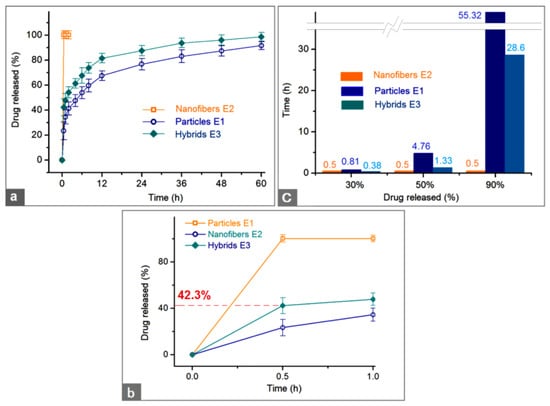 The first pre-determined time point for sampling was 0.5 h after the samples were placed into the dissolution media. The electrospun nanofibers E2 released all the loaded BH through an erosion mechanism, i.e., the drug BH and the polymeric matrix PVP were co-dissolved into the dissolution media (Figure 8b). This pulsatile release can be attributed to the following three reasons besides the fine solubility of PVP in water: (1) the small diameter of the nanofibers and the related large surface area, (2) the amorphous state of the drug BH, (3) the 3-D web structure of the fibrous mats and the related high porosity [79]. Compared with a 100% percentage release in 0.5 and 1 h, the electrosprayed microparticles E2 and electrospun hybrids E3 released 23.4 ± 7.1% and 42.3 ± 6.8% after 0.5 h dissolution and 34.5 ± 5.6% and 47.9 ± 5.3% within one-hour dissolution, respectively. After a time period of 60 h dissolution, microparticles E2 and hybrids E3 released 91.7 ± 3.2% and 98.6 ± 3.5%, respectively. These data suggested that the hybrids E3 could provide a typical biphasic release profile with a release amount of 42.3% at the first phase in a pulsatile manner and 56.3% (98.6–42.3%) at the second phase in a sustained manner. It seems that the electrosprayed particles E1 also furnished a biphasic release, i.e., 34.5% and 57.2% (91.7–34.5%) at the first and second phases, respectively. However, the release contents at different phases from hybrids E3 were intentionally tailored in a relatively accurate manner, whereas the release contents at different phases from the microparticles E1 were random and often uncontrollable. Thus, in pharmaceutics, this case was regarded as an abnormal phenomenon to drug sustained release, i.e., initial burst effect.