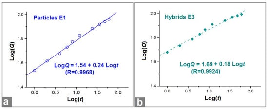To disclose the drug release mechanism, the Peppas equation (Q = ktn, where Q is the drug release content, k is a constant, and t is an indicator of drug release behaviors [80]) was exploited to regress the BH release data achieved during the in vitro dissolution tests (time ≥ 1 h). The results for the electrosprayed microparticles E1 and electrospun hybrids E3 are exhibited in Figure 9. For particles E1, the regressed equation was LogQ = 1.54 + 0.24 Logt (R = 0.9968). For the second phase of hybrids E3, the regressed equation was LogQ = 1.69 + 0.18 Logt (R = 0.9924). Both EHDA products had an n value smaller than the critical judgment value of 0.45, suggesting that BH was released from the CA microparticles through a typical Fickian diffusion mechanism, regardless of a sole state of microparticles E1 or a co-existing state with hydrophilic polymer PVP in hybrids E3.