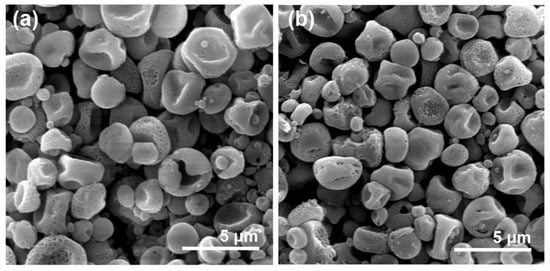 The SEM images of the residue microparticles after the exhaustion of BH molecules from the microparticles E1 (a) and the hybrids E3 (b).
