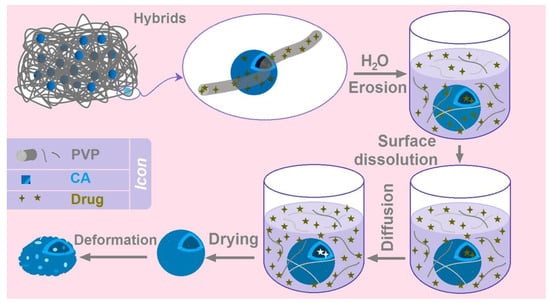 Based on the above-mentioned analyses, a diagram is shown in Figure 11. The combined mechanism of the BH biphasic release from the hybrids E3 containing electrospun PVP nanofibers and electrosprayed CA microparticles was clear. When the hybrids E3 are placed into the dissolution media, the BH-PVP nanofibers will be rapidly dissolved. This is a typical erosion process for the fast release of BH in the first phase. Later, the BH molecules distributed or absorbed on the surface of CA microparticles would dissolve into the dissolution media, by which the routes for water molecules’ penetration into the inner sections of CA particles gradually open. Along with the penetration of water molecules from surface to the core of CA microparticles, the loaded drug BH molecules would be free and inversely diffused from the CA particles to the bulk solution. During all the processes, the CA skeleton is insoluble and keeps the routes for diffusions and exchanges of both water and BH molecules. In theory, the diffusion process will not be terminated until a uniform BH distribution all over the bulk solution and a dynamic absorbance balance between the dissolution media and solid CA skeleton. After the CA skeletons are fetched out and dried, it is inevitable for them to experience some deformations.