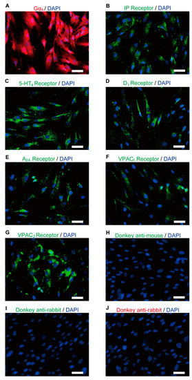 Immunofluorescence analysis of Gαs, IP, 5-HT4, D1, A2A, and VIP receptors in human odontoblasts. (A–G) Human odontoblasts showed positive immunoreactivity to Gαs (red in (A)), IP (green in (B)), 5-HT4 (green in (C)), D1 (green in (D)), A2A (green in (E)), VPAC1 (green in (F)), and VPAC2 receptors (green in (G)). (H–J) No fluorescence was detected in the negative control omitting the primary antibody to control the specificity of the immunostaining with Alexa 488 or 568. Nuclei are shown in blue. Scale bars; 50 µm.