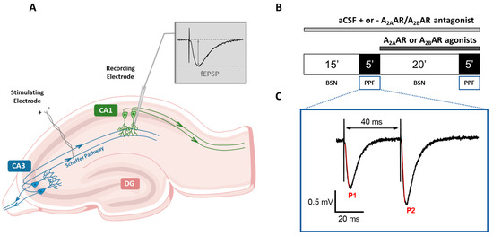 Experimental procedure. (A) Schematic representation of a hippocampal slice showing the synaptic circuits (DG: dentate gyrus; CA3: Cornu Ammonis 3; CA1: Cornu Ammonis 1) and the localization of the stimulating and recording electrodes. (B) Schematic diagram indicating the protocol utilized for drugs (A2BAR or A2AAR ligands) application. BSN: basal synaptic neurotransmission, PPF: paired–pulse facilitation. (C) Representative of a double field excitatory post–synaptic potential (fEPSP) response elicited by a PPF protocol (40–ms interval) in a typical experimental procedure. P1: first fEPSP; P2: second fEPSP.