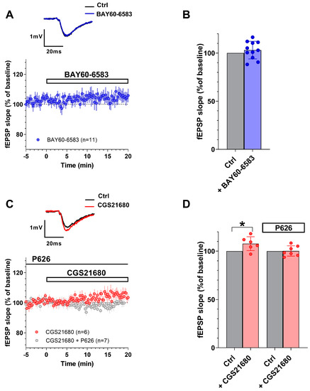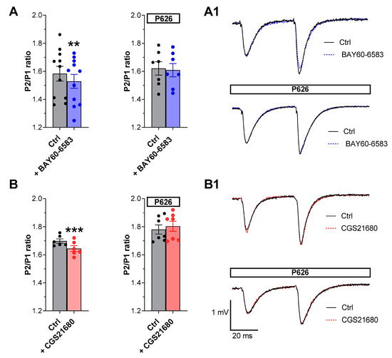 In addition, we evaluated the effects of P626 in the absence or presence of BAY60-6583 or CGS21680 during the application of PPF, a paradigm of short-term synaptic plasticity. Following previous results [15,16] we confirmed that either BAY60-6583 or CGS21680 (Figure 4), significantly decreased the PPF ratio in CA1 rat hippocampal slices. Indeed, the P2/P1 ratio of fEPSP slope values, measured at the end of a 20 min application versus respective pre-drug baseline values, was reduced from 1.58 ± 0.05 in the absence to 1.52 ± 0.04 in the presence of 200 nM BAY60-6583 (Figure 4A, n = 11). Regarding the A2AAR agonist, P2/P1 ratio was from 1.70 ± 0.01 in the absence to 1.64 ± 0.02 in the presence of 50 nM CGS21680 (Figure 4B, n = 6). The inhibitory effects induced by both “A2ARs” agonists on PPF were completely prevented in the presence of 200 nM P626 (Figure 4A,B). Globally these results suggest that P626, antagonizing the reduction in PPF induced by the selective stimulation of “A2ARs”, may counteract the increase in neurotransmitter release elicited by either of the two receptor agonists.