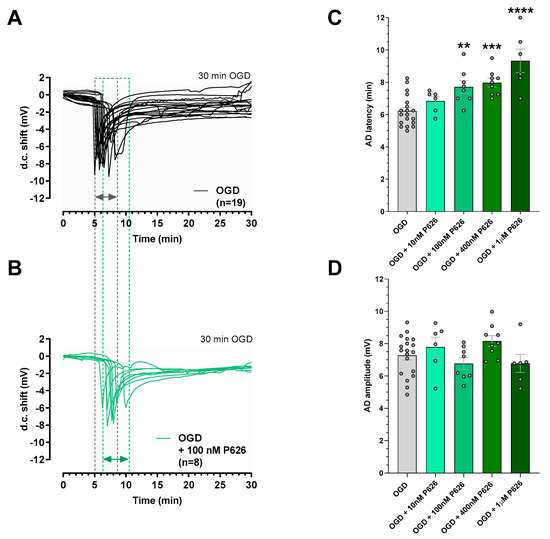 P626 delayed the appearance of anoxic depolarization (AD) induced by 30 min OGD without affecting AD amplitude in rat hippocampal slices. (A,B) The graphs show voltage traces of direct current (d.c) shifts recorded during 30 min OGD in untreated OGD slices ((A), n = 19 slices taken from 13 animals) or in the presence of 100 nM P626 ((B), n = 8 slices taken from 7 animals). Dotted lines and respective filled areas represent when the d.c shifts were recorded in the two conditions (grey–filled lines for the untreated OGD slices; green–filled lines for the P626–treated OGD slices). (C) Each column represents the mean ± SEM of AD latency recorded in CA1 hippocampal slices during 30 min OGD in different experimental groups. AD was measured from the beginning of the OGD insult. Note that 100 nM, 400 nM, and 1 µM P626 significantly delayed AD development. ** p < 0.01, *** p < 0.001, **** p < 0.0001 vs. OGD, one–way ANOVA followed by Bonferroni multiple comparison test. (D) Each column represents the mean ± SEM of AD amplitude recorded in the CA1 region during 30 min OGD. P626 10 nM: n = 6 slices taken from 5 animals; 400 nM: n = 9 slices taken from 8 animals; 1 µM: n = 6 slices taken from 5 animals.