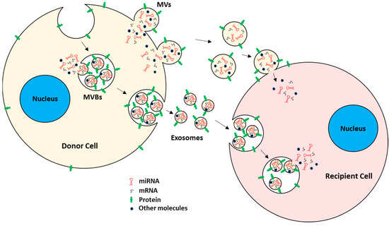 Intercellular communication, an essential biological process of multicellular organisms, is mediated by three different mechanisms: (1) cytoplasmic bridges; (2) direct interactions between adjacent cells via membrane proteins; and (3) cellular secretary molecules [1,2]. Recently, a fourth mechanism has been discovered, which includes the intercellular transfer of extracellular vesicles (EVs) [3,4,5,6,7,8,9,10]. EVs are membrane-bound entities released by almost all types of cells into the extracellular environment [11,12]. EVs are known to transport bioactive molecules, such as proteins, lipids, and nucleic acids in the form of DNA, RNA, miRNA (miR), etc., between cells [13,14]. Detectable levels of EVs are found in nearly all biological fluids, such as blood, urine, synovial fluid, and saliva, and they are even found in the interstitial spaces between cells [12,15,16,17]. Since they are protected from degradation by extracellular proteases and RNases, EVs can be stably stored for long-term use [18]. Depending on their biogenesis, size, release mechanism, content, and function, EVs can be broadly classified into microvesicles, exosomes, and apoptotic bodies (Figure 1) [11,12,19,20].