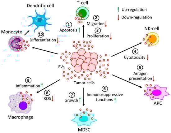 Effect of EVs generated during hematological malignancies on different immune cells. EVs, derived from tumor cells not only (1) induce apoptosis of T-cells, but also reduce T-cell (2) migration and (3) proliferation. Moreover, tumor-derived EVs (4) decrease the cytotoxicity of NK-cells and (5) restrain the processing of antigen by APCs. On the other hand, tumor-derived EVs (6) induce immunosuppressive functions of MDSCs, as well as (7) promote MDSCs growth. Again, tumor-derived EVs (8) not only prevent the generation of ROS in macrophages but also (9) promote macrophages’ pro-inflammatory response. (10) The differentiation of monocytes into dendritic cells is often perturbed by the incorporation of tumor-derived EVs into monocytes. All of these processes contribute to the development and progression of the tumor.