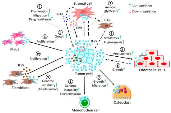 Crosstalk between tumor cells and cells in the TME through EVs. (1) EVs derived from tumor cells (tEVs) target stromal cells to release VEGF, which in turn induces growth of the tumor. tEVs induce the conversion of stromal cells into CAFs, which promote (2) tumor metastasis and angiogenesis. Moreover, tEV-fused stromal cells (3) induce the rate of aerobic glycolysis in tumor cells. On the other hand, (4) stromal cell-derived EVs (sEVs) promote proliferation and migration and confer drug resistance to tumor cells. (5) tEVs, upon fusion with endothelial cells, often promote angiogenesis, whereas (6) tEV-fused endothelial cells in turn contribute to tumor growth. (7) tEVs also promote the growth and migration of osteoclasts. More often, tEVs are shown to induce genomic instability in (8) several mononuclear cells and (9) fibroblasts, resulting in their transformation into pro-cancerous cells. (10) On the other hand, fibroblast-derived EVs (fEVs) induce the proliferation of the tumor. (11) Moreover, tEVs are also shown to induce the proliferation of MSCs, which in turn contribute to the progression of the tumor.