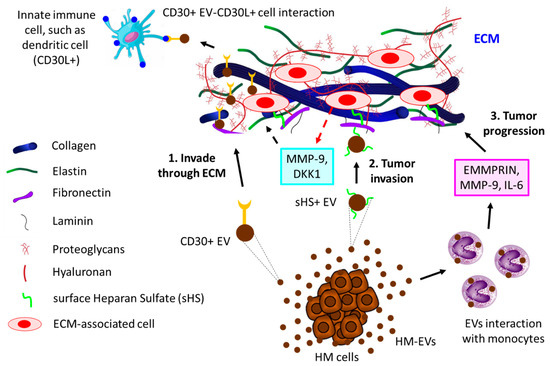 The interaction of HM-derived EVs with ECM leads to tumor progression. 1. HL-derived CD30+ EVs invade through ECM to reach distant innate immune cells (here shown is a dendritic cell, for example) that are positive for CD30 ligand (CD30L+), leading to tumor cell–immune cell interaction. 2. HM cells, such as MM-released sHS+ EVs, interact with ECM fibronectin, which further interacts with other ECM cells, thereby releasing MMP-9 and DKK1, which contribute to MM invasion through ECM. 3. HC-derived EVs induce monocytes to secrete EMMPRIN, MMP-9, and IL-6, which not only promote tumor invasion but also influence tumor inflammation, ultimately leading to tumor progression through ECM.