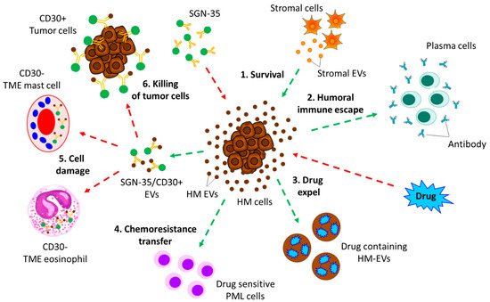 HL. Patients with higher HL stages were shown to have a reduced level of CD30+ [a marker for Hodgkin and Reed–Sternberg (HRS) cells] EVs in the plasma [195]. The presence of miR-155, miR-127, miR21, and let-7 in the plasma EVs of HL patients often serves as a diagnostic tool for the detection and therapy of tumors in HL patients [198,206].