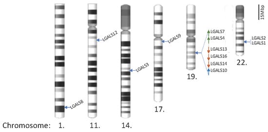 Figure 1. Locations of galectin genes in the human genome. Twenty galectin genes have been identified and are located on chromosomes 1, 11, 14, 17, 19, and 22. The partial q arms of chromosomes 1 and 11 are only shown to reflect the scale, and the scale bar represents 15 megabase pairs (Mbp) in gene distance.