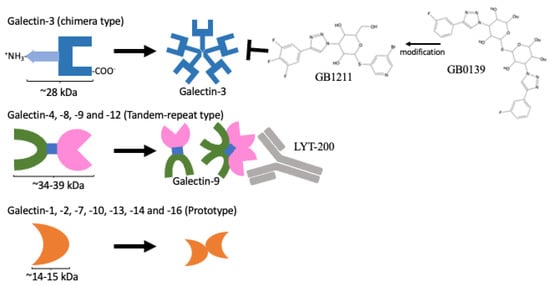 Figure 2. Protein domain structures of galectins and their inhibitors. Only the galectin-3 protein contains CRD domain and an extra amino domain allowing it to form an oligomer (upper panel). A protein containing two distinct CRDs, galectin-4, 6, 8, 9, and 12 (middle panel). A single CRD protein that can form homo-dimers, galectin-1, 2, 5, 7, 10, 11, 13, 14, and 16 (lower panel). GB1211 and LYT-200 represent a newly developed galectin-3-specific inhibitor [] and a humanised monoclonal antibody against galectin-9, respectively, and are currently under clinical trial.