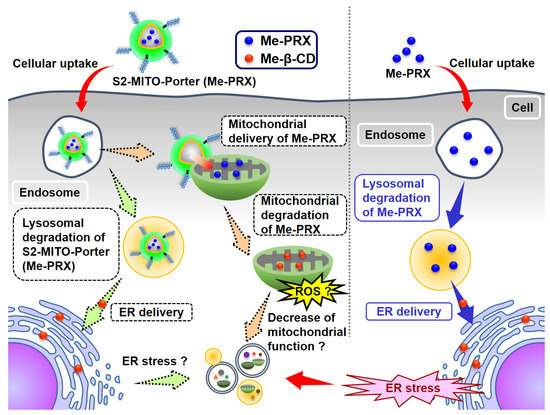 In the case of Me-PRX alone, Me-PRX is localized in lysosomes, and Me-β-CD is released by degradation in an acidic environment and is then translocated to the ER [6]. In the case of the S2-MITO-Porter (Me-PRX), on the other hand, there are two possible pathways after cellular uptake. The first possibility is that the S2-MITO-Porter (Me-PRX) escapes from the endosome, and Me-PRX is delivered to the mitochondria. The second pathway involves the S2-MITO-Porter (Me-PRX) undergoing degradation in the lysosomes, and the Me-β-CD resulting from the degradation is transferred to the ER. Based on the above considerations, we conclude that it is likely that when Me-PRX is introduced into the cell via the S2-MITO-Porter, the Me-PRX is transferred to both mitochondria and the ER.