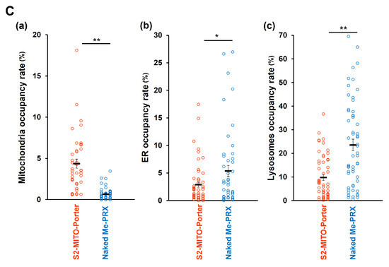 Figure 2. Intracellular observation of the Me-PRX and evaluation of organelle occupancy. HeLa cells were incubated with the BODIPY (a fluorescence dye)-labeled Me-PRX encapsulated in the S2-modified MITO-Porter (final conc. of Me-β-CD, 40 µM) (A) and naked BODIPY-labeled Me-PRX (final conc. of Me-β-CD, 1000 µM) (B) for 16 h. After staining the organelle, the cells were observed by CLSM. The green color indicates BODIPY-labeled Me-PRX (A,B; (ac)). The red color indicates mitochondria (a), ER (b) and lysosome (c), respectively. BODIPY-labeled MITO-Porter appeared as yellow clusters when it was localized in the organelle (mitochondria, ER or lysosome)—scale bars; 20 μm. In (C), the occupancy rates of mitochondria (a), ER (b) and lysosome (c) were calculated based on the CLSM images shown in (A,B) (see Section 2 for the details). Organelle occupancy that the carriers accumulated within the organelle region of the whole organelle region in the cell are summarized. Circles represent the values of individual cells summarized in each treatment. Bars are the mean value (n = 41–58). Significant differences were calculated by Student’s t-test (** p < 0.01, * p < 0.05).