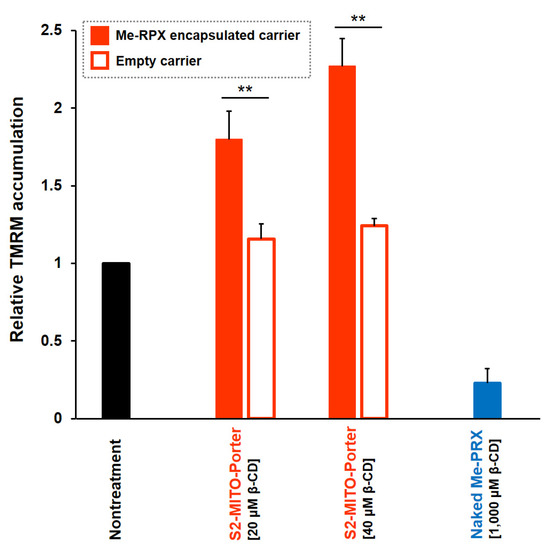Figure 3. Evaluation of mitochondrial membrane potentials. At 24 h after the addition of S2-MITO-Porter (Me-PRX) (final conc. of Me-β-CD, 20, 40 µM), the empty S2-MITO-Porter (lipid concentration equivalent to the S2-MITO-Porter (Me-PRX)) and naked Me-PRX (final conc. of Me-β-CD, 1000 µM) to HeLa cells, mitochondria were stained with TMRM, and TMRM fluorescence was measured using a flow cytometer. The staining of mitochondria with TMRM is dependent on the membrane potential; therefore, TMRM cannot stain mitochondria when the membrane potential is lost. The relative accumulation of TMRM was calculated as a relative value obtained by dividing the TMRM fluorescence of the sample-treated group by the TMRM fluorescence of the untreated cell group. Data are represented as the mean ± S.D. (n = 3). Significant differences were calculated by Student’s t-test (** p < 0.01).