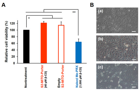 Figure 5. Evaluation of cell viability (A). At 48 h after the addition of the S2-MITO-Porter (Me-PRX) (final conc. of Me-β-CD, 40 µM), empty S2-MITO-Porter (lipid concentration equivalent to S2-MITO-Porter (Me-PRX)) and naked Me-PRX (final conc. of Me-β-CD, 1000 µM) to HeLa cells, WST-1 assays were performed to evaluate cell viability. Relative cell viability was calculated by setting the cell viability of untreated cells to 100%. Data are the mean ± S.D. (n = 3). Significant differences (** p < 0.01, * p < 0.05) were calculated by non-repeated ANOVA followed by the SNK test—observation of cell morphology (B). At 24 h after the addition of S2-MITO-Porter (Me-PRX) (final conc. of Me-β-CD, 40 µM) and naked Me-PRX (final conc. of Me-β-CD, 1000 µM) to HeLa cells, the cell morphology was observed using a microscope. (a) Nontreatment; (b) S2-MITO-Porter (Me-PRX) treated cells; and (c) naked Me-PRX treated cells. Scale bars: 30 µM.