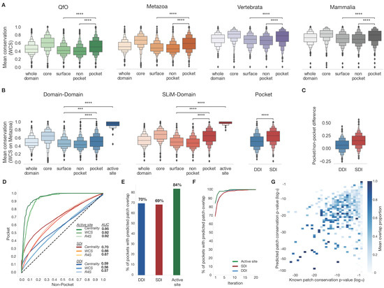 We evaluated weighted residue-based conservation scoring (WCS) on orthologue alignments from four sets of proteins from proteomes of species with different levels of evolutionary divergence (Mammalia, Vertebrata, Metazoa, Quest for Orthologs (QfO) [55], see supplementary material for a list of species in each database). The weighted residue-based conservation scoring can discriminate between the pocket and non-pocket residues in all orthologue alignment sets (Figure 2A). The metazoa-based alignment shows the most discriminatory power between the pocket and non-pocket regions (p-value: 5.66 × 10−44) compared to the three other orthologue alignments sets (QfO p-value: 1.95 × 10−40, Vertebrata p-value: 1.31 × 10−36, Mammalia p-value: 1.45 × 10−25). Next, we evaluated metazoa-based scoring separately on the domain-domain (DDI), SLiM-domain (SDI), and the active site PDB benchmarking dataset. We observed a significant difference between the pocket and non-pocket residues for both DDI and SDI sets (DDI p-value: 3.44 × 10−8, SDI p-value: 5.27 × 10−44) (Figure 2B,C). Interestingly, SDI pockets are clearly more conserved than DDI interfaces in the benchmarking dataset (p-value: 1.94 × 10−14) (Figure 2B,C). Active sites are the most conserved set in all cases and are significantly more conserved than surface residues in both interface sets (DDI p-value: 5.53 × 10−26, SDI p-value: 1.21 × 10−33) (Figure 2B). Finally, we compared the WCS-weighted residue-based conservation scoring to the Rate4Site scores [56,57] from ConSurf [19,20]. The WCS scoring scheme’s ability to discriminate between binding pocket residues and non-pocket residues is comparable to Rate4Site scores which use slower Bayesian estimation for scoring residues (SDI AUC—Rate4Site:0.67, WCS:0.66; DDI AUC—Rate4Site:0.57, WCS:0.56) (Figure 2D).