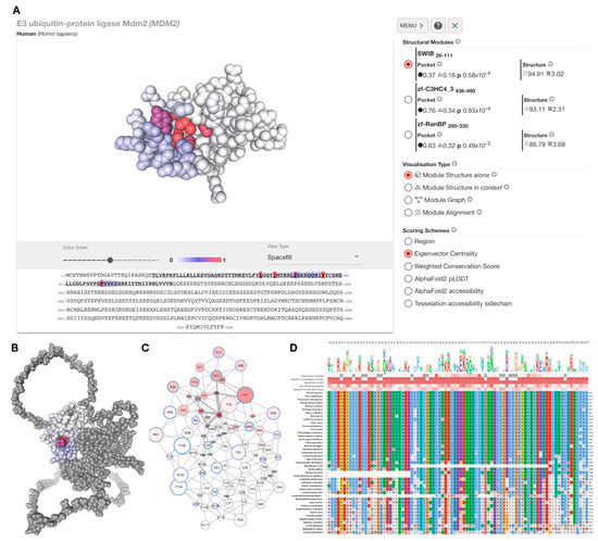 Overview of xProtCAS web server. (A) The results analysis page of MDM2 consists of an interactive 3D viewer, a sequence viewer and a side menu containing the structural modules of the protein, the conserved accessible surface metrics for the structural modules, and a set of visualisation options. (B) The SWIB structural module of MDM2 in the context of the full-length protein coloured by weighted conservation scores (WCS). (C) A graph representation of the SWIB domain structural module of MDM2. The graph displays each residue as a node represented with a circle in the graph; the filling colour of the circle reflects the chosen scoring scheme, and the blue colour of the circles’ circumference shows if the residue is a contacting residue in any known interface. The circle size reflects the residue’s accessibility. Neighbouring nodes are connected with edges where edge thickness represents centrality scores. (D) Multiple sequence alignment view of the SWIB domain structural module of MDM2. A variant of the Clustal X Colour Scheme is used to colour residues. The default scheme colours are used, in addition, negative BLOSUM64 scoring positions are coloured grey and charged residue changes are denoted by circles. The sequence logo shows the composition of the alignment column of each position scaled by residue accessibility to emphasise more conserved and accessible residues. Each position is hoverable and reveals a tooltip with a detailed description.