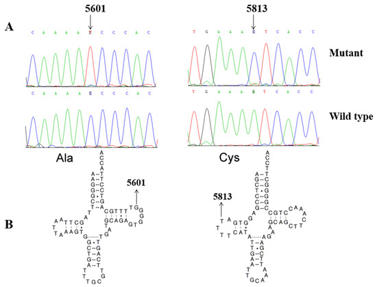 (A). Identification of tRNAAla C5601T and tRNACys T5813C mutations by Sanger sequencing. (B) The locations of m.C5601T in tRNAAla and m.T5813C in tRNACys.