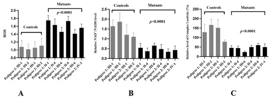 MtDNA-CN was considered as a proxy for mitochondrial function [35]. To see whether m.G11696A mutation affected mtDNA function, RT-qPCR was performed to determine the mtDNA-CN. As shown in Figure 6A, a ~37% average reduction was identified in individuals who carried the m.G11696A mutation when compared with the controls (p < 0.0001).