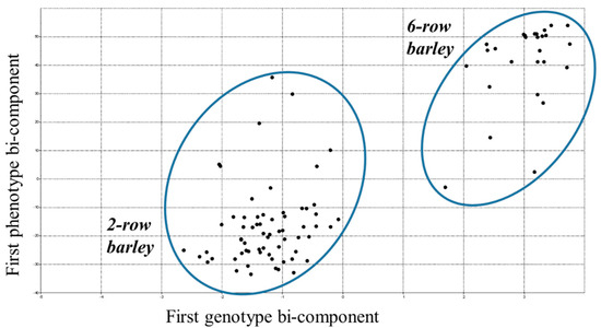 Partial least squares based on genetic distance calculated for 94 accessions and the results of three-year measurements of four agronomic traits. The analysis clearly shows that two clusters correspond to two row types.