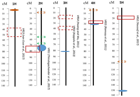 It was known that locus VRS3 is located on chromosome 1H. The candidate gene underlying VRS3 was identified by Wilma van Esse and collegues [49] in the interval 35.7–52.6 cM. The marker revealed in the study (JHI-Hv50k-2016-1755) is located in the 3.19 cM region and it does not match the supposed location of the locus VRS3.