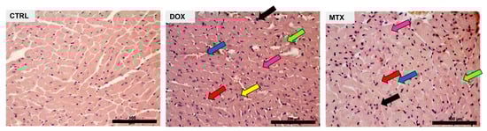 Effect of DOX and MTX on heart structure assessed by light microscopy. Representative light micrographs obtained through hematoxylin and eosin staining from CTRL, DOX, and MTX mice are depicted (representative images of three animals analyzed per group). The CTRL group showed normal morphology and structure. DOX group presented cellular oedema (pink arrow), necrotic zones (green arrow), large and uncondensed nucleus (yellow arrow), vacuolization (red arrow), inflammatory infiltration (black arrow), and vascular congestion (blue arrow). MTX group showed cellular oedema (pink arrow), necrotic zones (green arrow), vacuolization (red arrow), inflammatory infiltration (black arrow), and vascular congestion (blue arrow). Images were taken at 40× magnification (scale bar = 100 µm). For additional quantitative data, please consult references [] and [] for DOX and MTX, respectively.