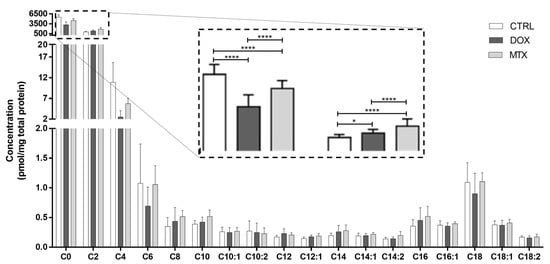 Effect of DOX and MTX on the cardiac acylcarnitine profile assessed by MS/MS. Values are expressed as mean ± SD (n = 5–6) of concentration, and statistical analyses were performed with two-way ANOVA followed by Tukey’s multiple comparisons test: * p < 0.05, **** p < 0.0001. C0: carnitine, C2: acetylcarnitine, C4: butyrylcarnitine, C6: hexanoylcarnitine, C8: octanoylcarnitine, C10: decanoylcarnitine, C10:1: decenoylcarnitine, C10:2: decadienoylcarnitine C12: dodecanoylcarnitine, C12:1: dodecenoylcarnitine, C14: myristoylcarnitine, C14:1: tetradecenoylcarnitine, C14:2: tetradecadienoylcarnitine, C16: palmitoylcarnitine, C16:1: palmitoleoylcarnitine, C18: stearoylcarnitine, C18:1: oleoylcarnitine, C18:2: linoleylcarnitine.