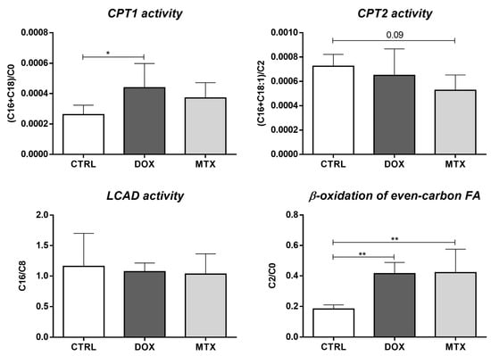 Furthermore, the activity of enzymes involved in FA oxidation can be evaluated through the ratios of specific acylcarnitines []. Herein, we estimated the activity of carnitine palmitoyl-transferase 1 (CPT1) and 2 (CPT2), long-chain acyl-CoA dehydrogenase (LCAD) along with the β-oxidation of even-carbon FA, using the ratios among C0, C2, octanoylcarnitine (C8), palmitoylcarnitine (C16), stearoylcarnitine (C18) and oleoylcarnitine (C18:1) (Figure 4). DOX group seemed to increase the activity of CPT1, given by the ratio of C16+C18 over C0, while the MTX group showed a tendency to decrease the activity of CPT2 ([C16+C18:1]/C2 ratio, p = 0.09). However, no differences were observed for LCAD activity (C16/C8 ratio) after DOX or MTX. Nonetheless, both DOX and MTX seemed to increase the oxidation of FA with even-carbon (C2/C0 ratio).