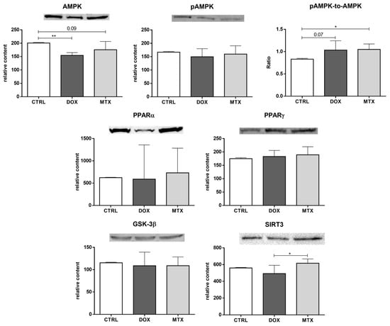 Additionally, several metabolic modulators of the previous energy pathways were assessed (Figure 6). DOX decreased the content of AMPK, while MTX induced a tendency towards decreased values of this sensor of cellular energy status [], compared to the CTRL group (p = 0.09). Despite no differences for pAMPK content, MTX increased the pAMPK-to-AMPK ratio, and DOX showed a tendency towards increased values of this ratio compared to the CTRL group (p = 0.07), which is suggestive of AMPK activation. For the other metabolic modulators evaluated, PPARα, PPARγ, and GSK-3β, no differences were found among the groups. Additionally, the content of SIRT3 was decreased in the DOX group compared to MTX, despite no differences found when comparing those groups with the CTRL group.