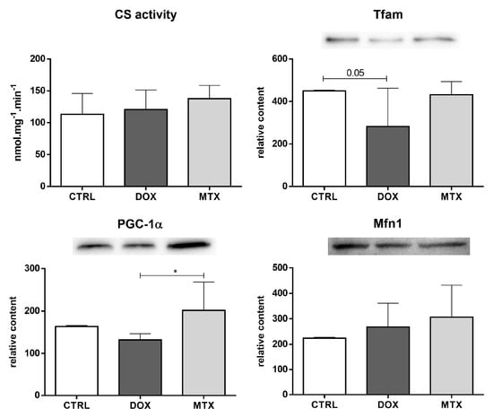 The activity of CS, which is considered a rough marker of mitochondrial density [], was not altered in any of the drug-exposed groups (Figure 7). Nevertheless, the content of Tfam was decreased in the DOX group compared to CTRL. No other differences regarding the mitochondrial biogenesis markers, namely on PGC-1α and Mfn1, were seen when comparing the drugs to the CTRL group. However, DOX had decreased content of PGC-1α compared to the MTX group.