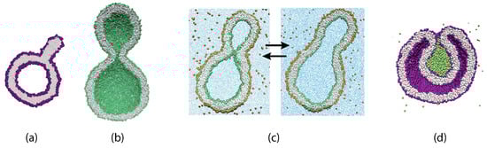 Simulation snapshots of nanovesicles that illustrate their remodeling for different leaflet tensions: (a) Cross-sectional view of a nanovesicle that undergoes a structural instability, generating a micellar protrusion [30]; (b) Half cut view of a vesicle that forms a dumbbell shape with a closed membrane neck [28]; (c) Cross-sectional views of recurrent shape changes between dumbbells with open and closed necks [29]; (d) Half cut view of a condensate droplet (green) that is completely engulfed by the in-bud of a nanovesicle and will divide into two daughter vesicles [31]. All vesicle bilayers in (b–d) have the same surface area, which is about 3.6 times larger than the area of the vesicle bilayer in (a).