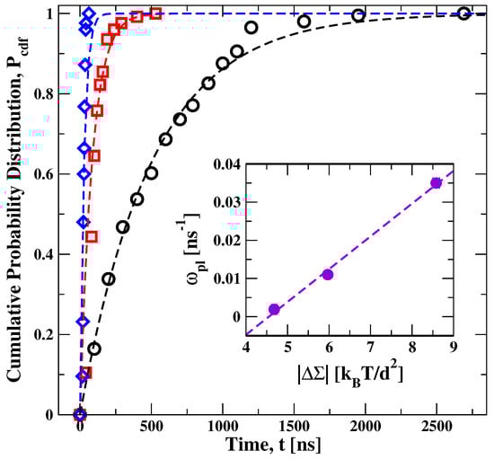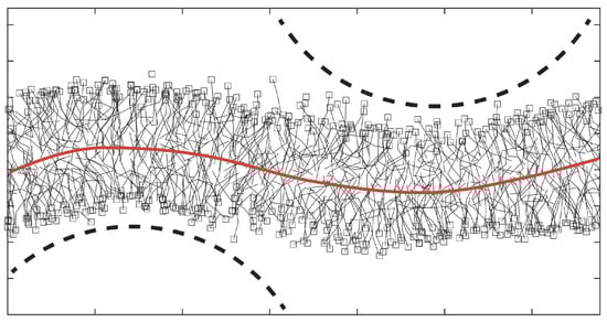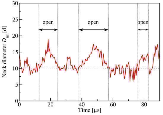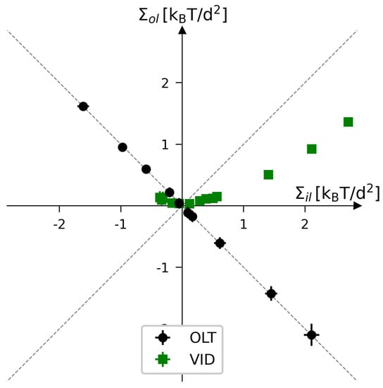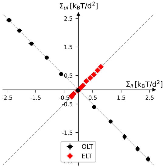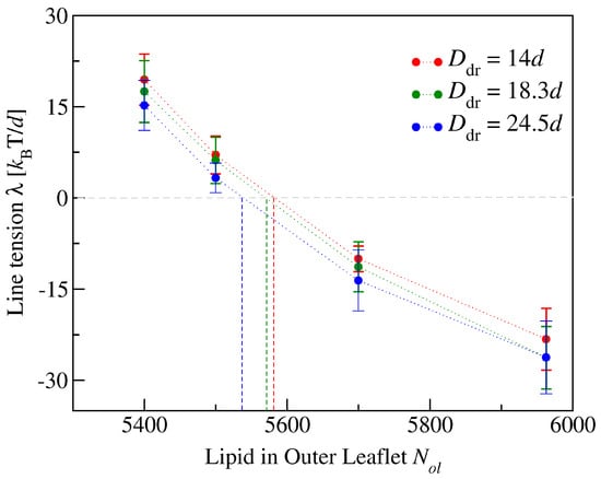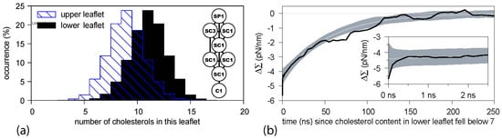 As depicted in Figure 3 and Figure 5, the leaflet-leaflet interface undergoes shape fluctuations. Therefore, we need to consider the average position of this interface, obtained by sampling a large number of statistically independent conformations. Because of the periodic boundary conditions used in the planar bilayer simulations, the average position of the leaflet-leaflet interface is then fully characterized by its average z-value, , which defines the midplane of the bilayer membrane. The two leaflet tensions and of the lower and upper leaflet are then obtained from [24,25,27]